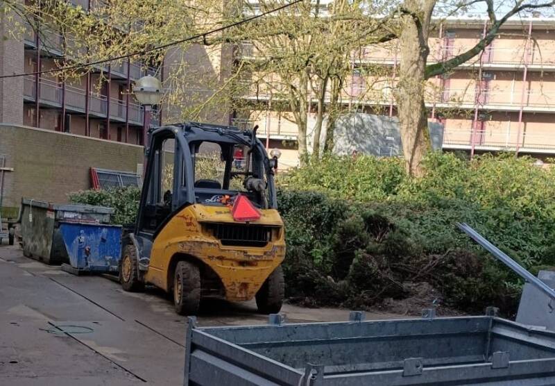 Er worden opschoondagen georganiseerd om de bewoners de mogelijkheid te bieden om hun overtollige spullen op een makkelijke manier op te ruimen. De mensen van Knaapen Groep komen alles wat op de galerij staat ophalen en wordt afgevoerd in containers. Dat heeft natuurlijk een paar grote voordelen, de mensen raken hun overtollige spullen op een makkelijke manier kwijt, maar wat nog belangrijker is er komt meer ruimte in de appartementen om in te werken. Op de foto hierboven zie je de spullen op de galerij staan en de heftruck met container die de diverse zaken gaat afvoeren.